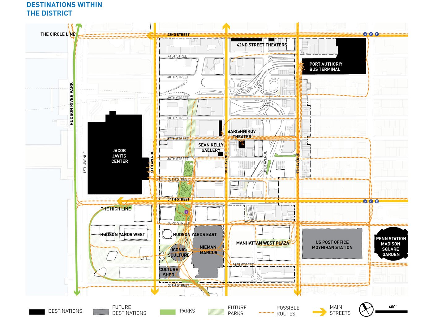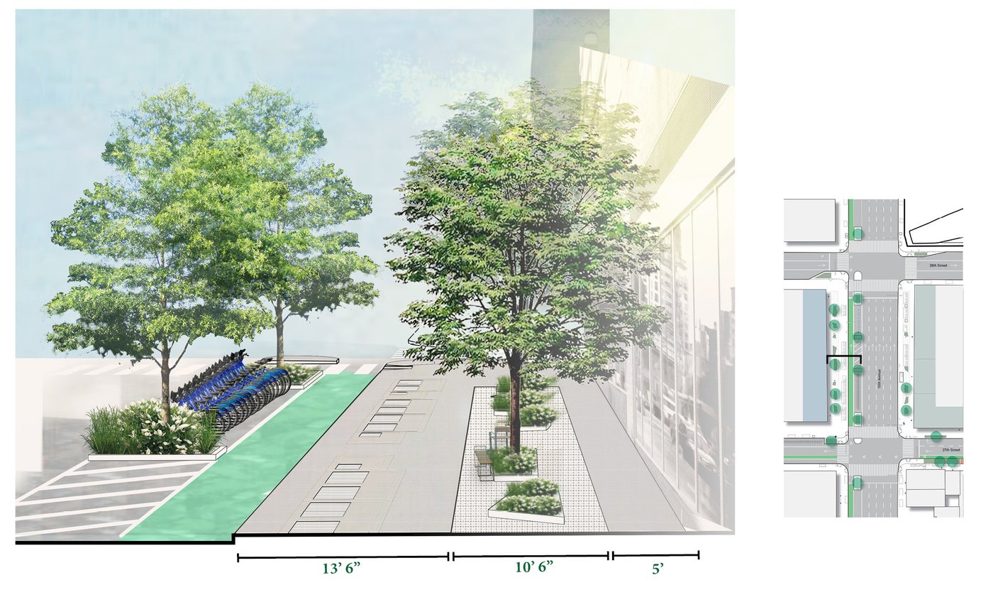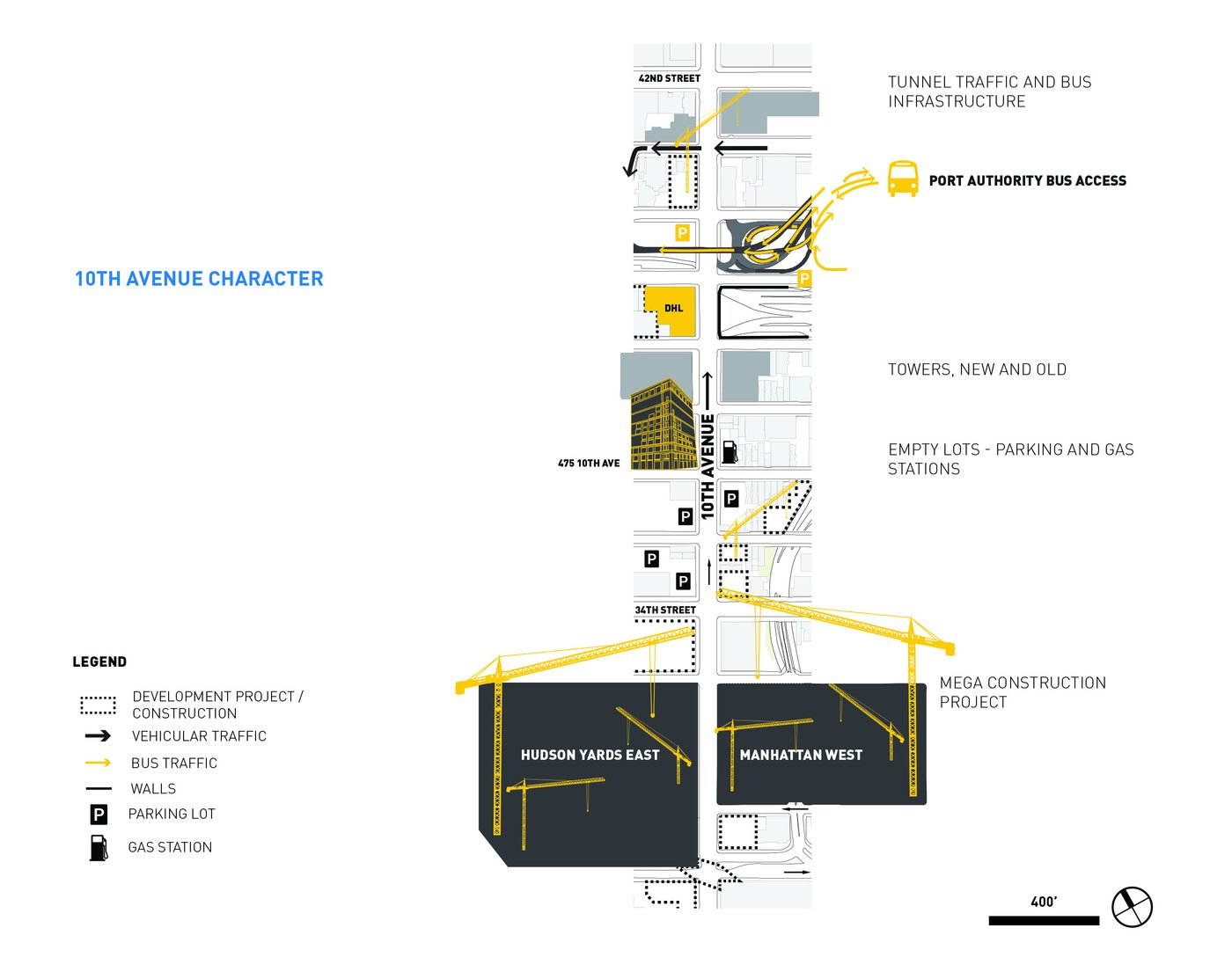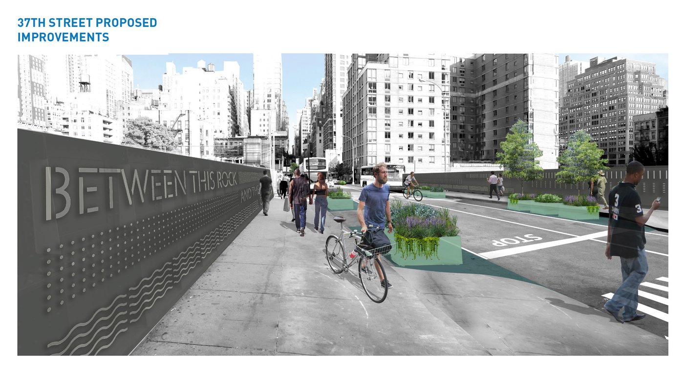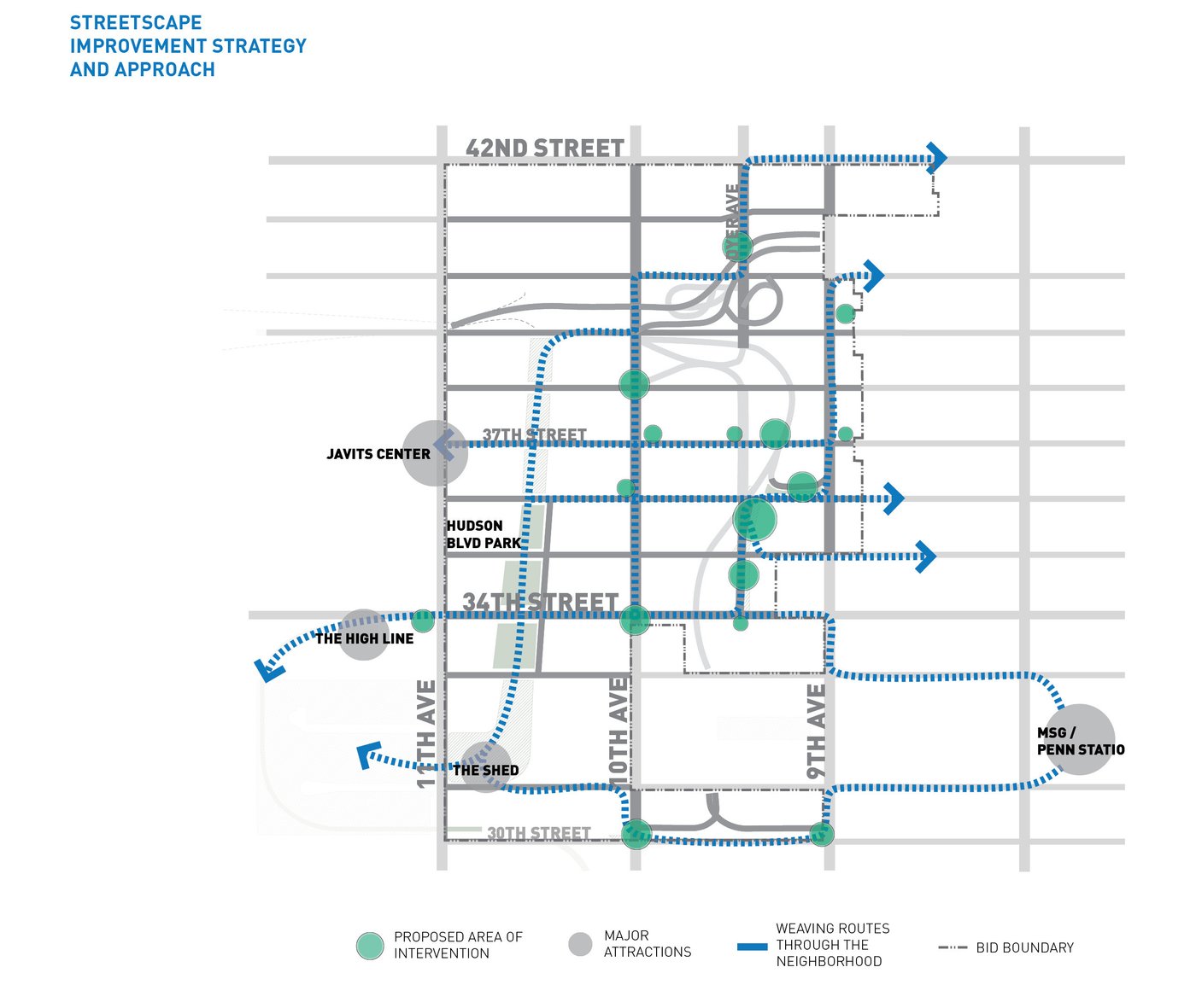 Hell's Kitchen/Hudson Yards is a new business improvement district propelled by dramatic changes within its boundary. MNLA's master plan and tactical transformations stitch together a neighborhood in flux. Deeply impacted by the Lincoln Tunnel, Port Authority bus terminal, and new construction, the public realm is confusing and hazardous. Design solutions target excessive roadway widths, poor signage, overhead roadways, and disconnected verges for improvements. The comprehensive plan offers site-specific designs for wayfinding, the creation of new public places, protected bike lanes, and traffic calming.