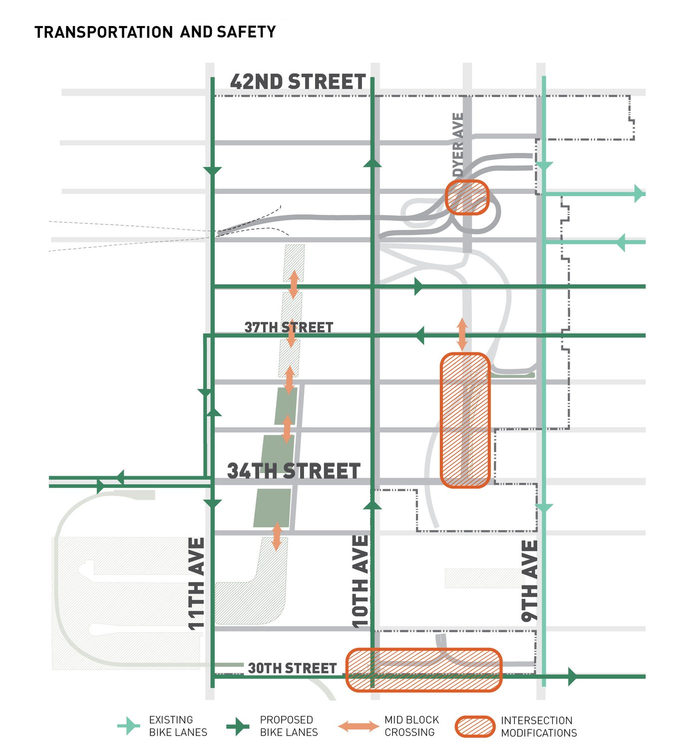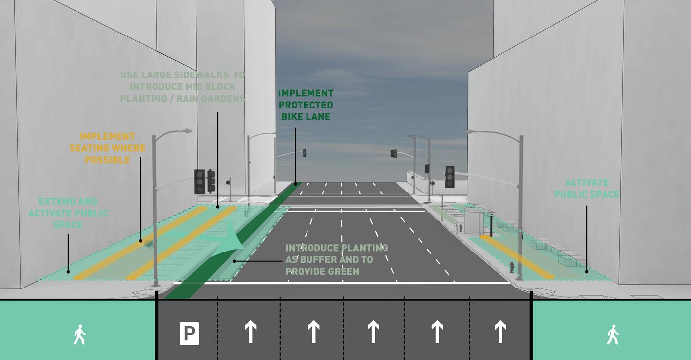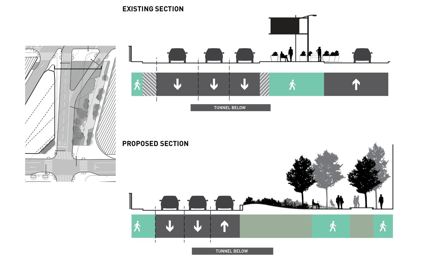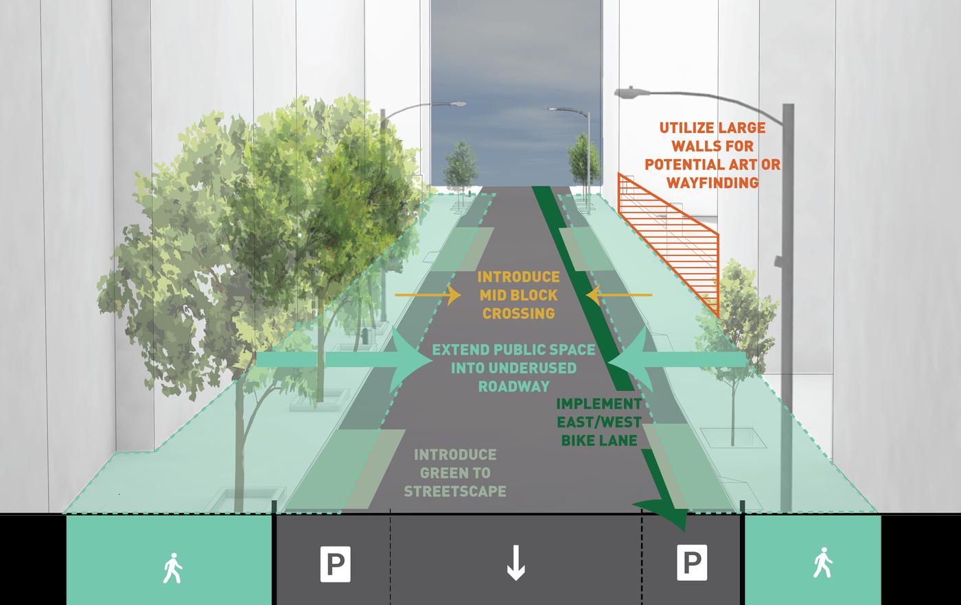 Hell's Kitchen/Hudson Yards is a new business improvement district propelled by dramatic changes within its boundary. MNLA's master plan and tactical transformations stitch together a neighborhood in flux. Deeply impacted by the Lincoln Tunnel, Port Authority bus terminal, and new construction, the public realm is confusing and hazardous. Design solutions target excessive roadway widths, poor signage, overhead roadways, and disconnected verges for improvements. The comprehensive plan offers site-specific designs for wayfinding, the creation of new public places, protected bike lanes, and traffic calming.