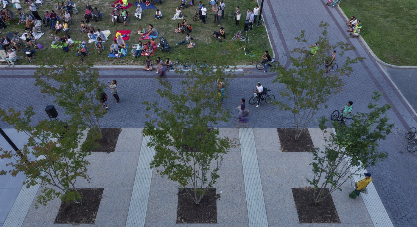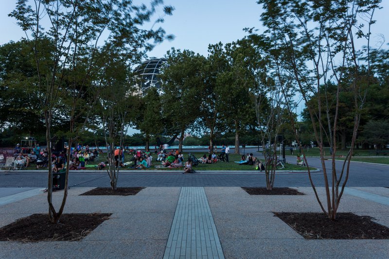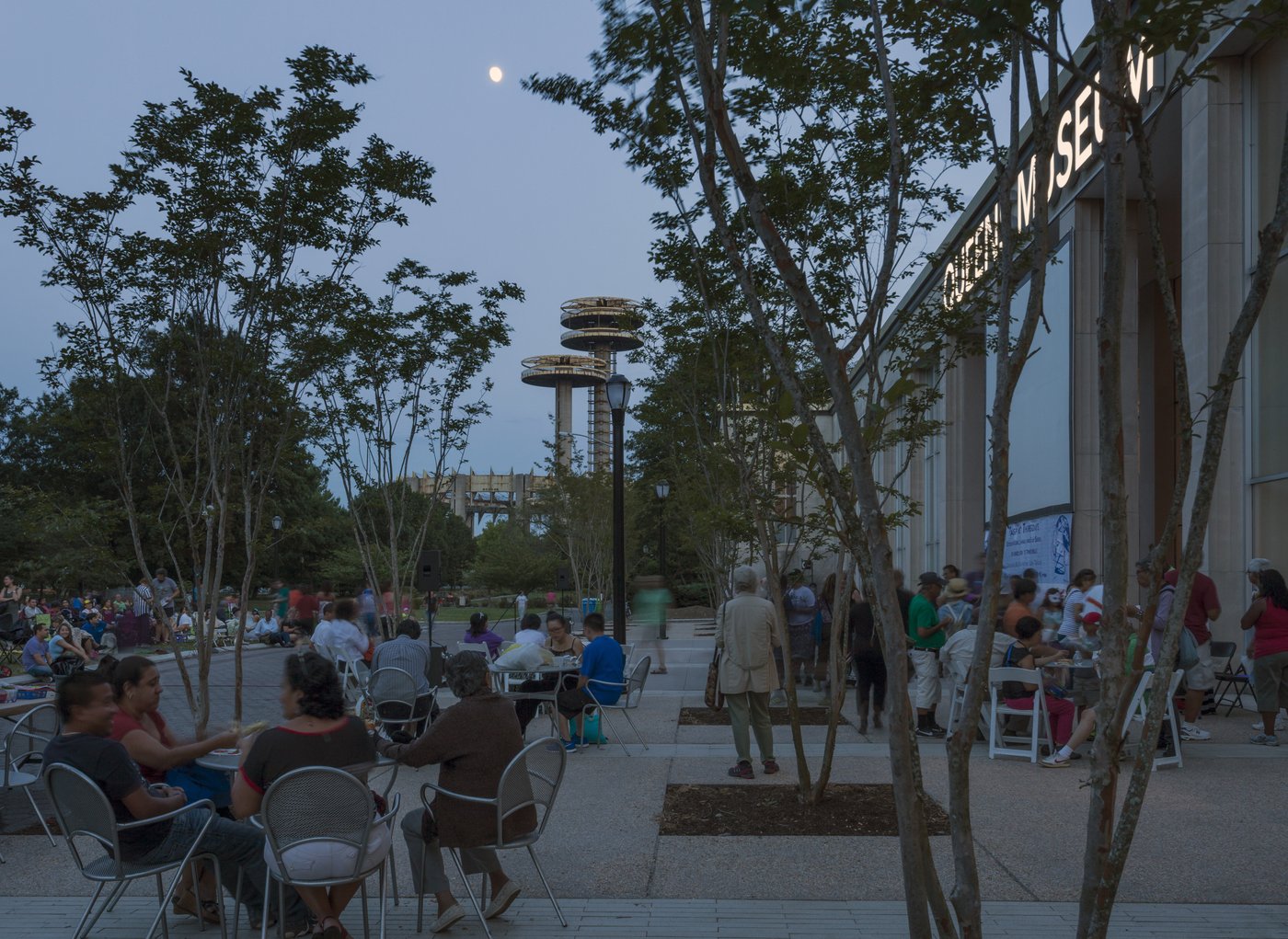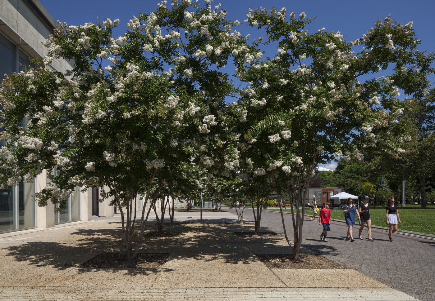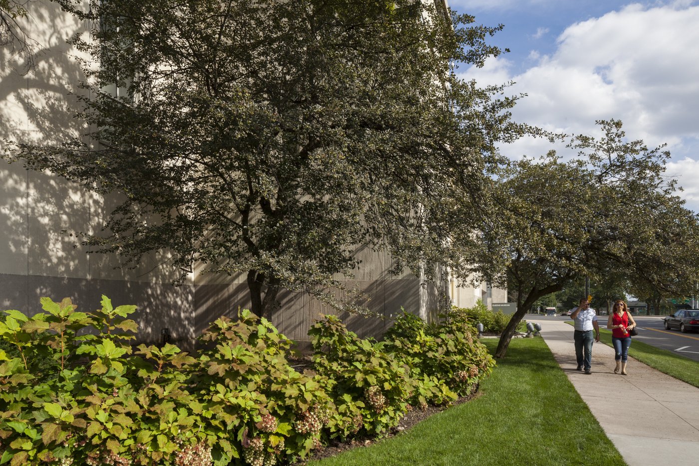 MNLA's design for the surrounding public spaces balances seamless integration into the park with museum program. The east side forms a shaded plaza that serves as the primary entry from the park, while an expanded lawn affords seating for summer movies. The plaza's tree grove reinforces the museum's symmetrical, transparent facade and corresponding paving. The new west facade acts as a vehicular portal to the building with an innovative graphic facade and vehicular drop off zone.