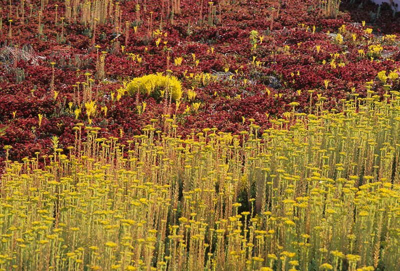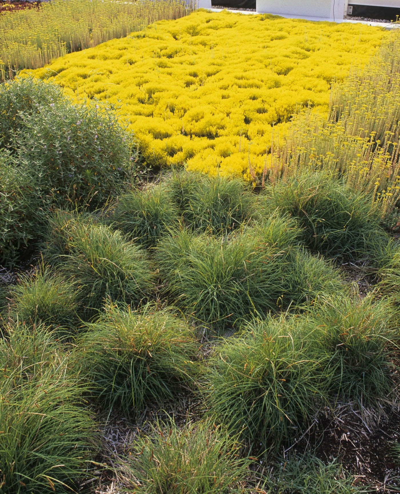 The many varieties of sedum were planted in geometric patterns on the roof are interesting to observe from surrounding buildings.